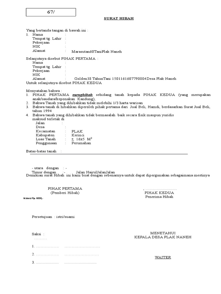 Meskipun sudah diangkat sebagai anak, anak angkat bukanlah anak kandung, jadi dia tidak berhak menerima harta warisan. Namun jika hibah tersebut tidak disertai dengan surat keterangan hibah maka bukan tidak mungkin akan terjadi permasalahan di kemudian hari dikarenakan beberapa hal. Selain itu, karena yang anda tanyakan adalah hibah kepada salah seorang anak, perlu anda ketahui juga bahwa ada pengaturan lain dalam kuhper mengenai hibah kepada anak. Sedangkan 2 orang kakak perempuan saya diberikan rumah yang lebih kecil dari bagian saya. Contoh surat keterangan hibah tanah surat keterangan contoh surat hibah tanah 2015 contoh surat lengkap Contoh surat kuasa tanah dari ahli waris. Contoh surat keterangan hibah dari orang tua ke anak have an image from the other.contoh surat keterangan hibah dari orang tua ke anak it also will feature a picture of a kind that may be observed in the gallery of contoh surat keterangan hibah dari orang tua ke anak. Sedangkan 2 orang kakak perempuan saya diberikan rumah yang lebih kecil dari bagian saya. Ini dia beberapa contoh suratnya. Namun perlu diketahui kalau penggunaan surat memang tidak bisa ditinggalkan karena ada banyak hal dan urusan yang masih membutuhkan surat. Surat hibah kebun sawit semua surat. 15 contoh surat hibah tanah rumah benda dll paling lengkap seiring dengan perkembangan zaman dan kecanggihan teknologi sekarang ini maka penggunaan surat sebagai media komunikasi juga sudah semakin berkurang. Contoh surat hibah orang tua ke anak 1 surat hibah tanah.